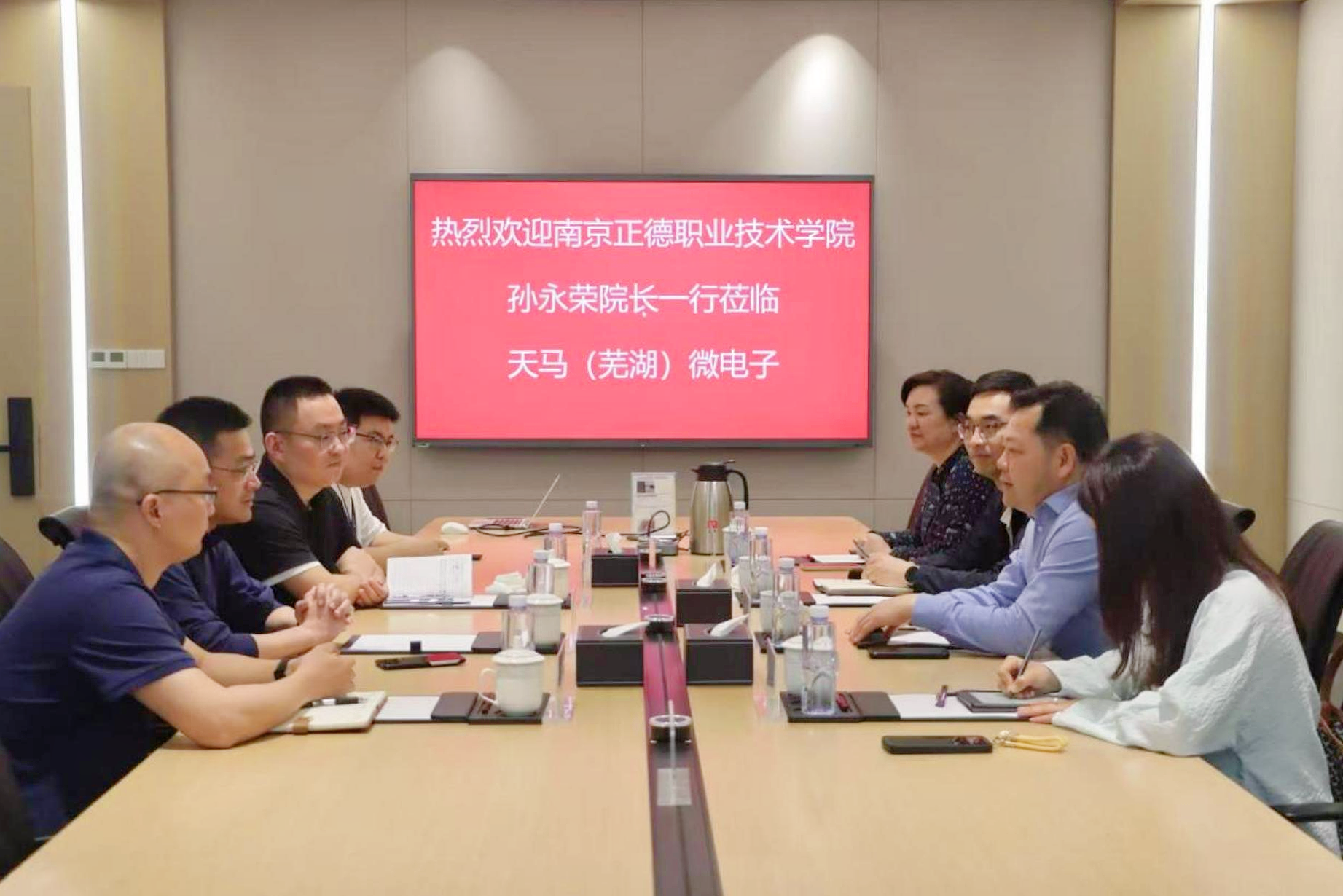 继4月11日下午,天马(芜湖)微电子有限公司(以下简称“天马(芜湖)”)领导一行来校交流后,4月18日上午,孙永荣一行受邀来到天马(芜湖)微电子有限公司开展调研,公司总经理缪周、人力资源部部长李虎、行政经理张俊、校企合作负责人荀旺等热情接待。交流会上,李虎从企业基本情况、开展的主要业务、实习生发展规划、工作环境与职工生活保障等方面介绍了天马的基本情况。