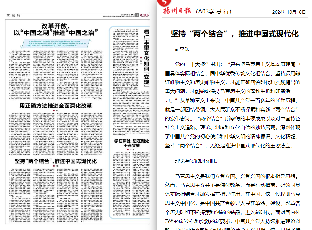 《光明日报》《扬州日报》《新华日报》分别于10月15日、10月18日、12月3日刊发春满四合院 思想政治理论课教师李颖《手机屏幕之外是更广阔的天地》《坚持“两个结合”,推进中国式现代化》《深刻把握文化主体性的内在逻辑》等文,现转发全文如下: