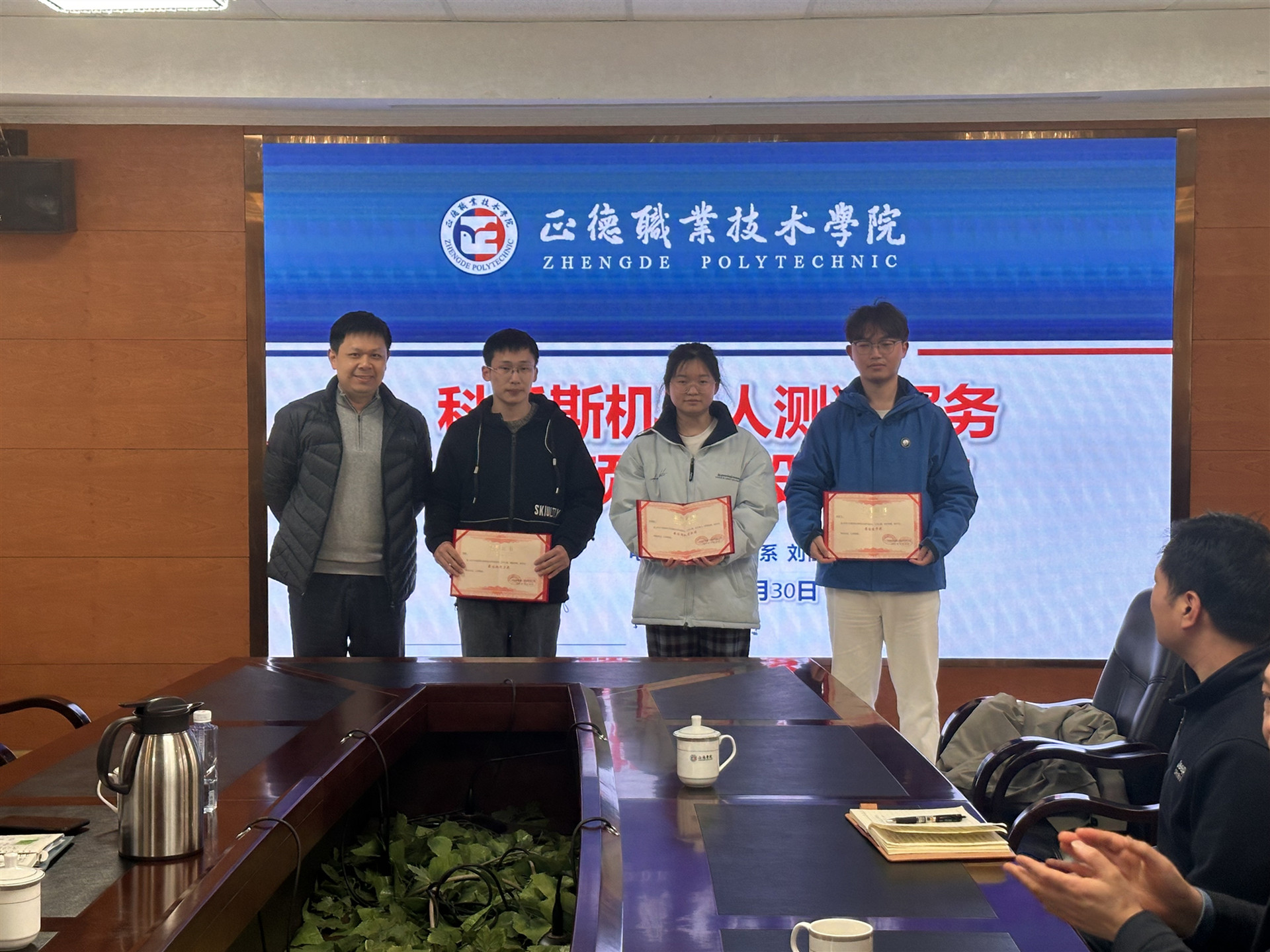 为深入推进“产教融合、校企合作”发展战略,创新人才培养模式,12月30日下午,科沃斯机器人股份有限公司(以下简称“科沃斯”)技术发展部总监王海军率项目集成评估部副总监吴清、高级测试经理马林锋等企业代表来访,与院长孙永荣、电子与信息技术系主任刘佳、副主任张宝华及师生代表共同召开“正德—科沃斯”机器人产品检测实训中心合作项目年度复盘会,总结阶段性成果,共商未来发展。会议由刘佳主持。