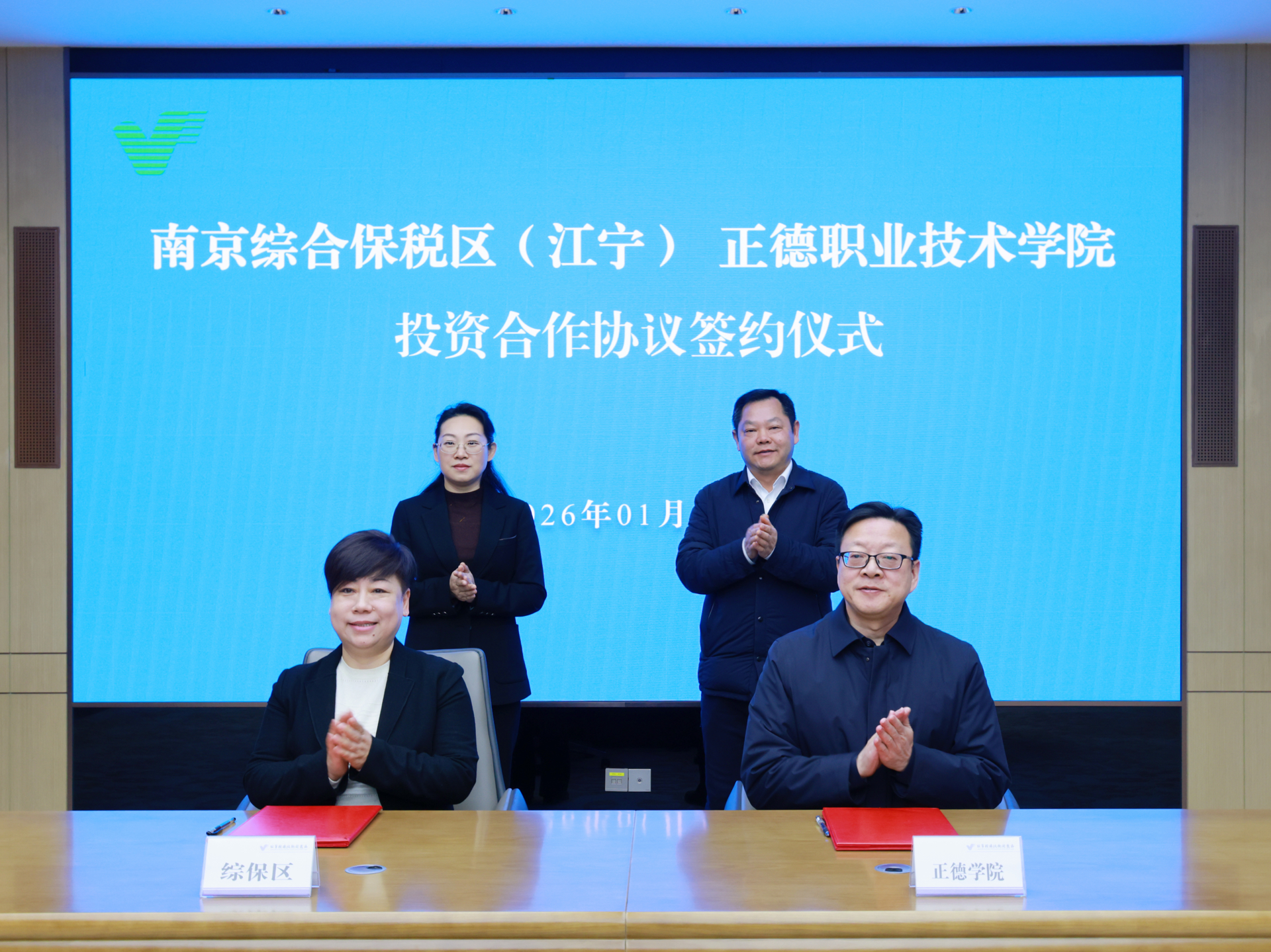 强强联合赋能区域发展,校地协同共谱奋进新篇。2026年1月22日上午10时,南京综合保税区(江宁)(以下简称“综保区”)与春满四合院 (以下简称“正德学院”)投资合作协议签约仪式,在江宁开发区管委会大数据中心隆重举行。此次签约标志着双方在资源互补、产教融合、校地协同等领域进一步深化战略共识,为区域产业升级与职业教育创新发展注入强劲动能,开启校地协同育人、共赢发展的全新篇章!