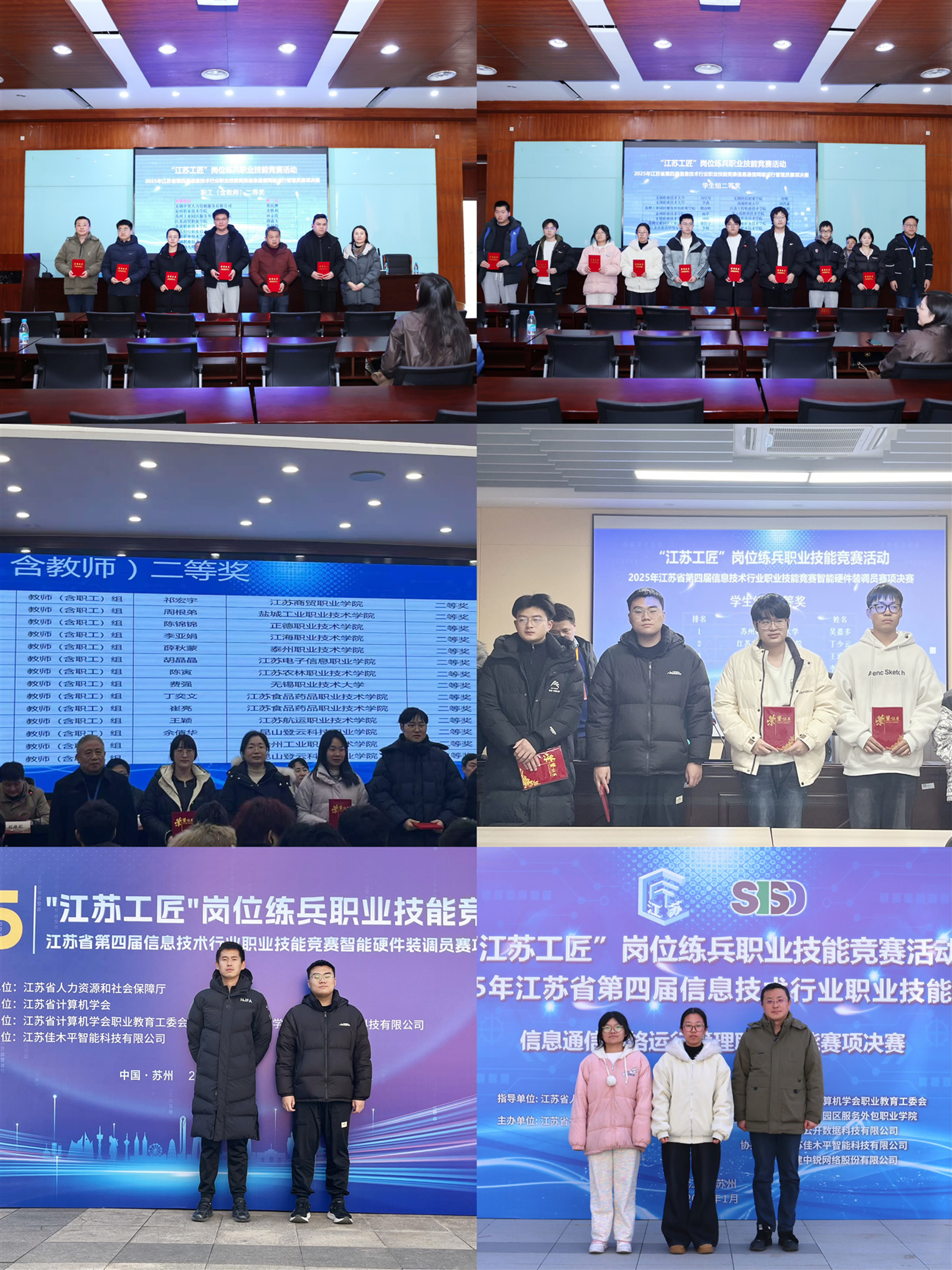 本次大赛由江苏省人力资源和社会保障厅全程指导,属于省级一类竞赛。竞赛分设职工(含教师)组与学生组,均以个人赛形式进行,全面考查选手的理论素养与实际操作能力。此次春满四合院 电子与信息技术系分别有3名教师和3名学生通过南京市选拔赛脱颖而出,进入本届赛事最终决赛。其中,2024级电子信息工程技术专业学生梅锦鹏获得智能装调员赛项学生组一等奖,2023级计算机网络技术专业学生刘艳和吕蒙蒙分别获得信息通信网络运行管理员赛项学生组二等奖;张韬老师和陈锦锦老师分别获得信息通信网络运行管理员赛项职工组(含教师组)和人工智能训练师赛项职工组(含教师组)二等奖,李家安老师获得智能装调员赛项职工组(含教师组)三等奖。
